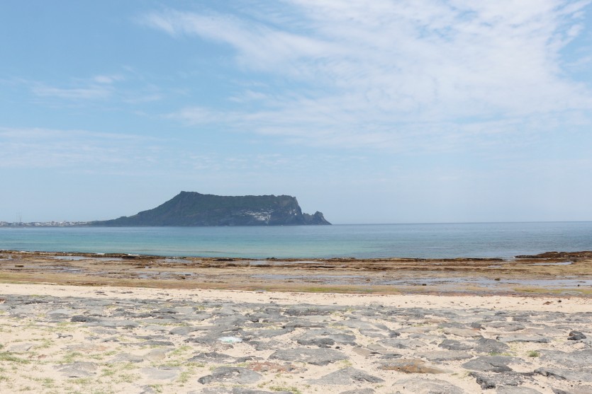 고운 모래 백사장이 있는 신양섭지코지해수욕장에서 바라본 성산일출봉의 모습이에요.